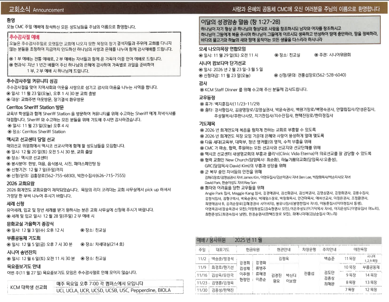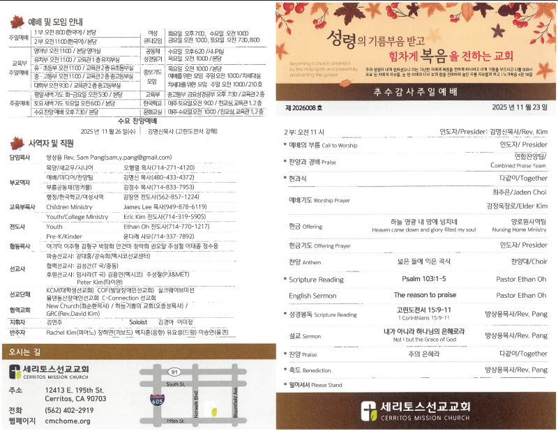 2025년 11월 23일(추수감사주일) 2부 주보 페이지 정보 작성자 세리토스선교교회 날짜 2025-11-22 15:20 목록 본문 2025년 11월 23일(추수감사주일) 2부 주보 이전글2025년 11월 30일 주일주보 25.12.04 다음글2025년 11월 23일(추수감사주일) 1부 주보 25.11.22 댓글 0 댓글목록 등록된 댓글이 없습니다. 목록