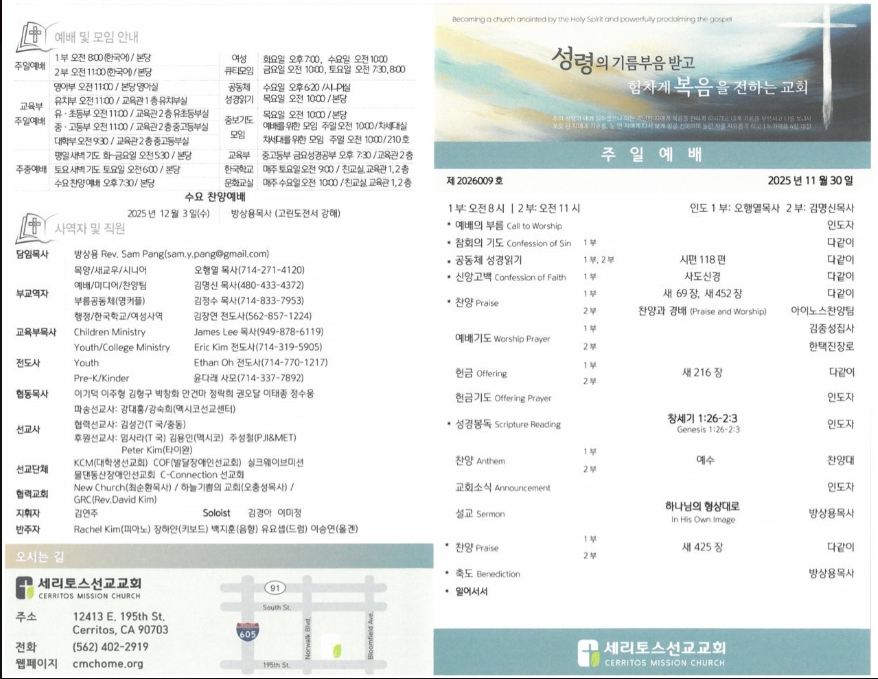 2025년 11월 30일 주일주보 페이지 정보 작성자 세리토스선교교회 날짜 2025-12-04 13:29 목록 본문 2025년 11월 30일 주일주보 이전글2025년 12월 7일 주일주보 25.12.06 다음글2025년 11월 23일(추수감사주일) 2부 주보 25.11.22 댓글 0 댓글목록 등록된 댓글이 없습니다. 목록